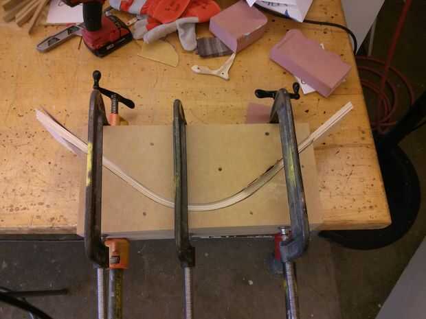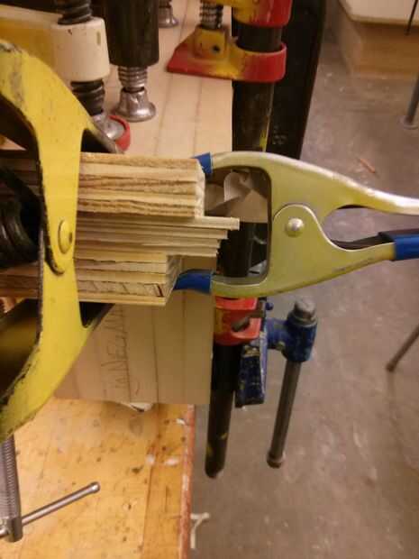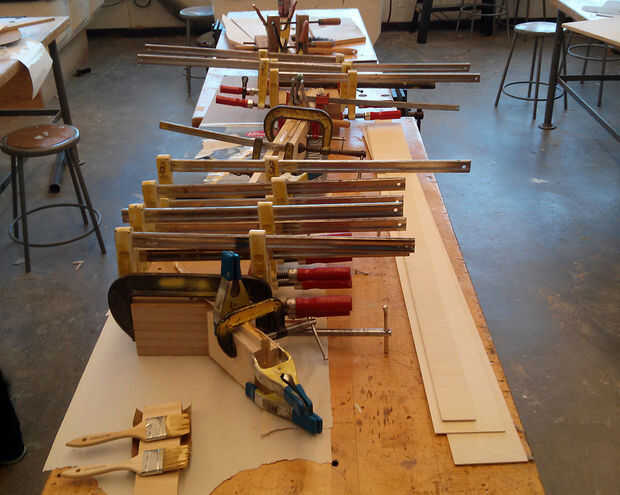 Una vez que todas las piezas de madera contrachapada se pegan en el molde, sujete el molde entero juntos firmemente. Abrazaderas más siempre están mejores. Deje que el conjunto de elementos y el resto durante al menos 8 horas antes de la moldura les. Apartarlas durante 24 horas para una curación completa.