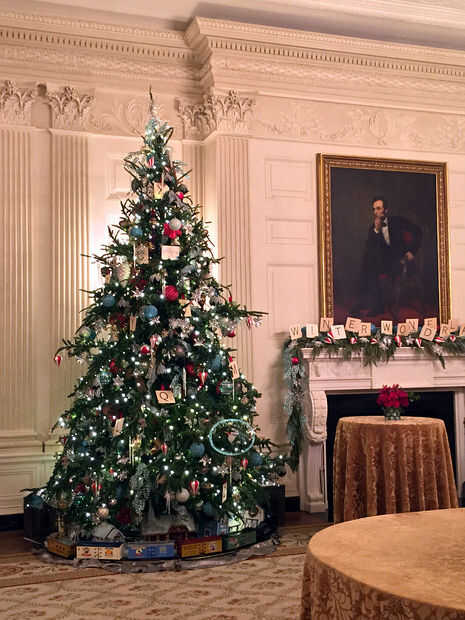 1. mi 3D impreso adorno en un árbol de Navidad en el comedor de Estado junto a un rico pintado retrato del Presidente Lincoln encima de una chimenea de la chimenea.