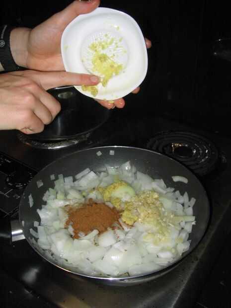 Paso 4: Añadir especias, jengibre y ajo a las cebollas