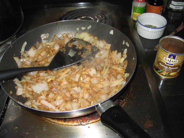 picantes frijoles y verduras, con la omnipresente tomate asan. Un gran plato o vegetariano principal.Paso 1: Saltear la cebolla y pimientos 2 cebollas medianas, picadaspimientos, picados (tipo/cantidad a gusto; Yo usé Serranos)aceite de canola para c