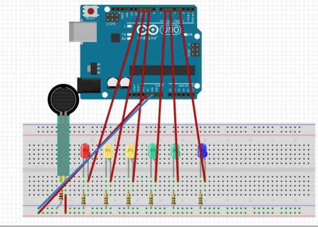 Nota: Cuando usted pone los pernos en el Arduino, cualquier color puede ir a cualquier pin, pero el código debe ser editado. Debe utilizar pernos que la ~ al lado del número, como los de uso analógico del perno. Utilizaremos modulación de anchura de pulso para cambiar el brillo de los LEDS depende de la presión, por lo que debe utilizar los pasadores con la ~. Es probablemente más fácil utilizar los pernos que menciono aquí para que usted no tiene que editar el código.