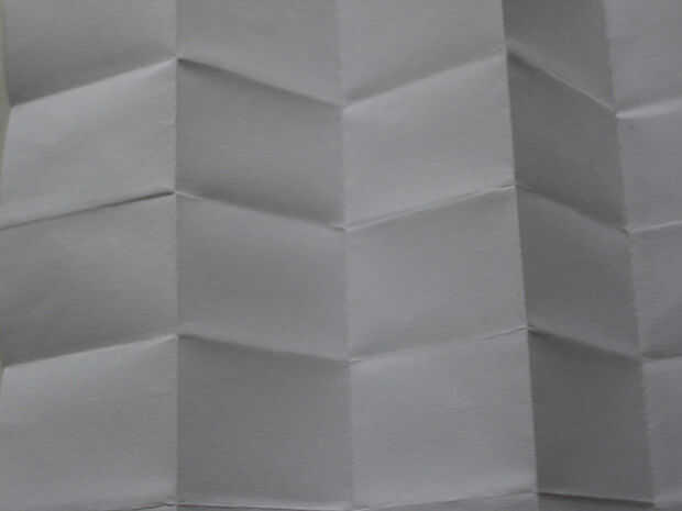 Ya que la tela será doblada acordeón-estilo, necesitas pensar en si cada pliegue sucesiva debe ser un "Valle" o una "montaña" – deben alternarse en la tela. La primera foto de este paso muestra valle y montaña de dobleces en una hoja de papel.