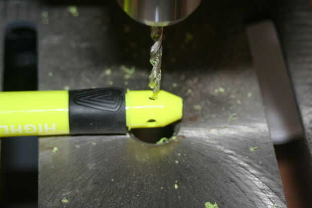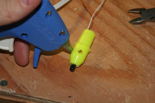 En este punto probablemente podría hacer un montón de cosas para asegurar el interruptor en el cuerpo de la pluma pero unos agujeros perforados y empujado en un poco de pegamento caliente.  Tuve cuidado de no empujar demasiado pegamento porque sólo quería que sostenga en su lugar para que el botón aún podía moverse.