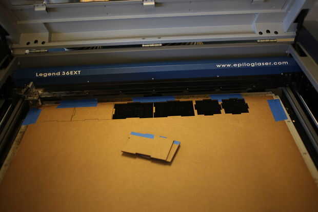Cinta adhesiva un trozo de cartón a los gobernantes en la cama de láser y ejecutar un corte sólo la geometría exterior de mis partes. Levanto las piezas de cartón linterna para crear un espacio en mi pieza.