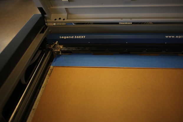 Cuando estoy trabajando con madera, me gusta la máscara de la superficie de mi material.  La máscara será proteger la superficie de hollín y vapores producidos durante el proceso de corte de la resina.  También quiere asegurar la pieza a mi lámpara con cinta de enmascarar.  Esto ayudará a evitar que el material se mueva accidentalmente durante el proceso de corte.  Esto es especialmente importante si encuentro que tengo que hacer varias pasadas para conseguir un corte limpio.
