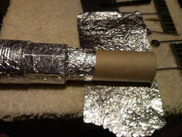 Una tira fina de pegamento caliente sobre el papel de aluminio para iniciar la envoltura Asegúrese de conseguir apretado pero no usted rasgar el papel, extremo de pegamento caliente cuando está envuelto.