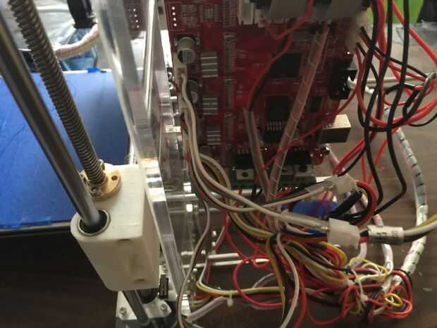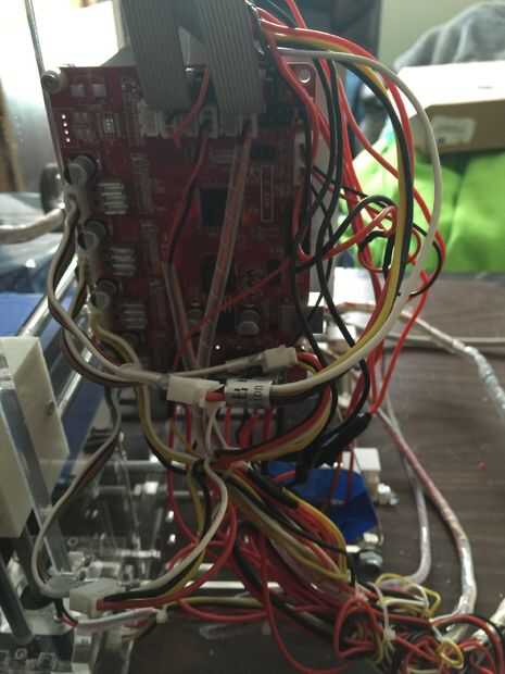 Una vez que mi máquina estaba armada empecé a probar usando el panel de control. Inmediatamente fue obvio que había un gran problema. Sólo el eje Y fue capaz de "home" hasta que el interruptor de límite fue golpeado! El eje X y Z que tanto funcionaron al revés!!!!!! Además de esto, la extrusora expulsado filamento en vez de tirar y a través de la boquilla de impresión!