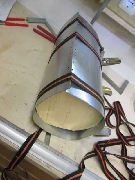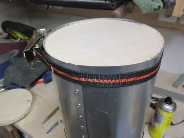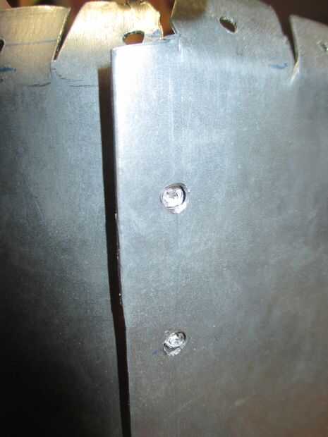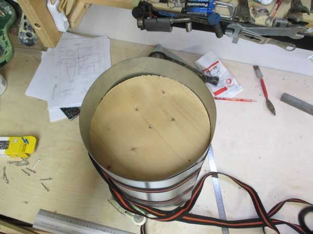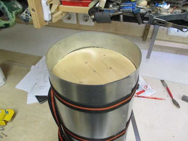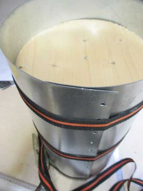 Entonces solía regulares abarcando las correas lentamente dobla el metal alrededor de los círculos de madera hasta que los extremos superponen. Si ha medido todo bien los agujeros coincidirá con los del otro lado. Si te don´t lo hizo bien, que se superpone mucho más de lo que necesita. Pero that´s bien, porque la tensión en el metal lo doblará de todos modos tan it´s no hay problema si tienes círculos un poco más pequeño que el necesario.