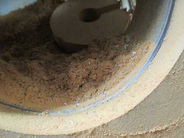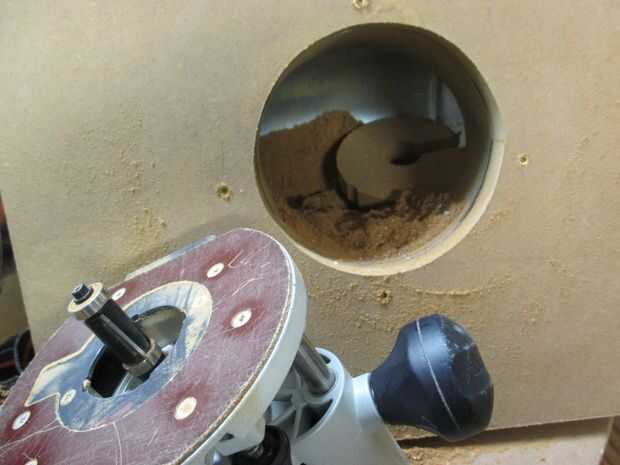 Es necesario hacer agujeros en la placa base y me decidí hacerlo de la forma sucia. Yo corte dos agujeros de forstner en medio de las placas y atornillados los puertos de 150mm en la parte superior. Con una broca de corte recto con guía cojinete se ampliaron los agujeros con el diámetro exacto de las conexiones de conducto. Pero - ya que el metal está doblado en los bordes - algunos metales de la conexión con mi broca caro. La mierda ocurre. debería funcionar bien en el MDF todavía, pero creo que it´s no ya sostenido bastante para madera dura.