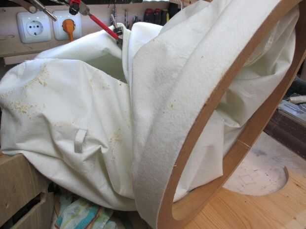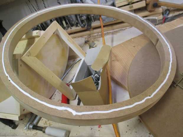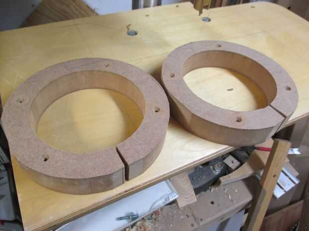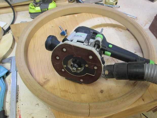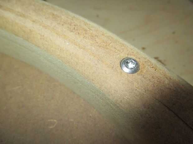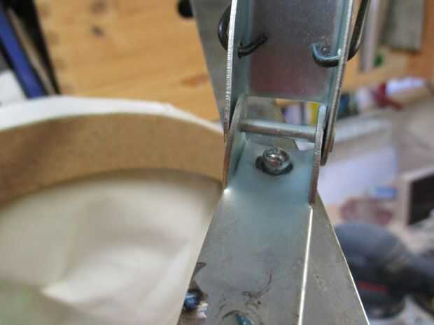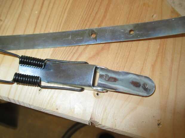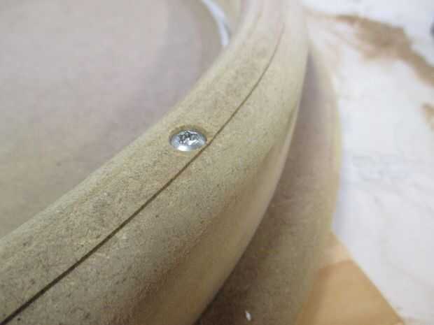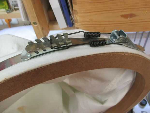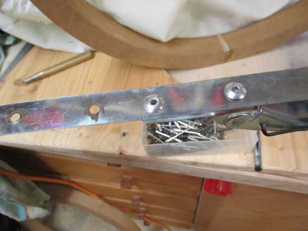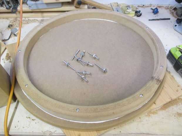 Con las bolsas vino dos metal correas con abrazaderas pero didn´t montar en mi medida MDF anillos por lo que necesitaba cortar los remaches viejos y taladrar dos agujeros nuevos con el nuevo diámetro. Afortunadamente la correa era lo suficientemente larga para añadir otro 5 cm al diámetro.