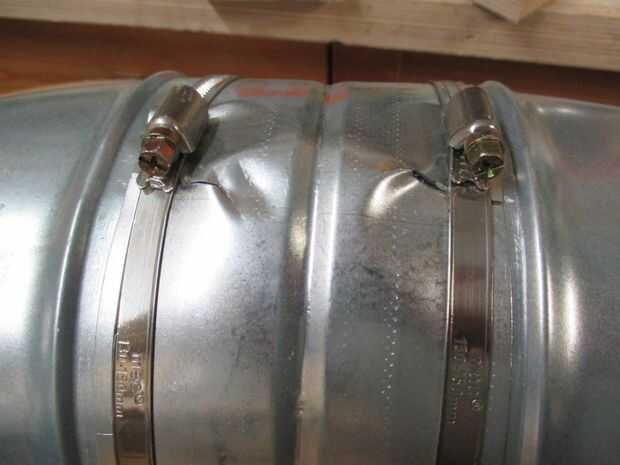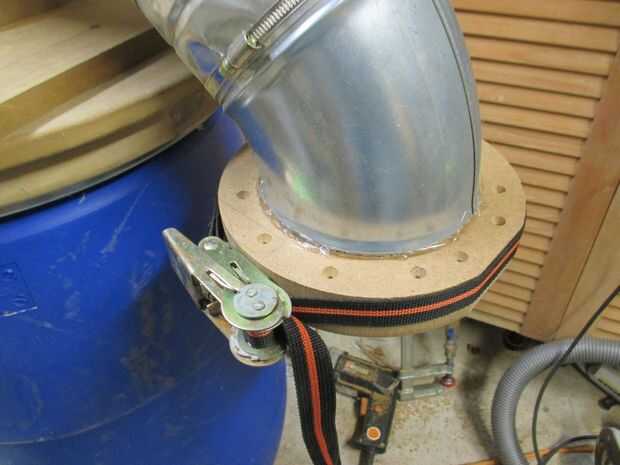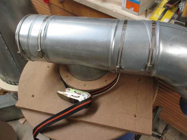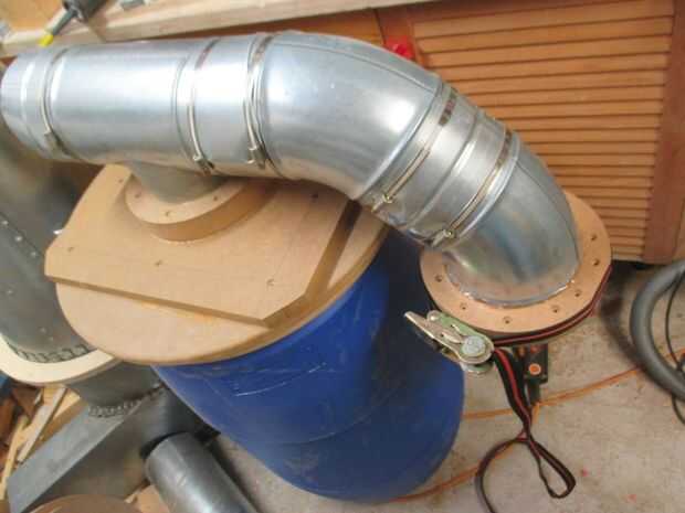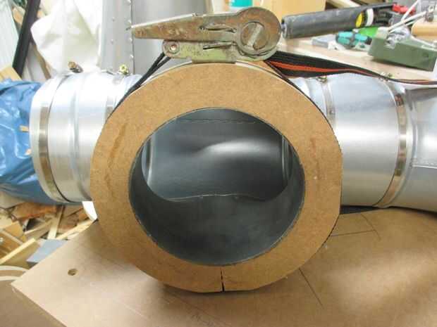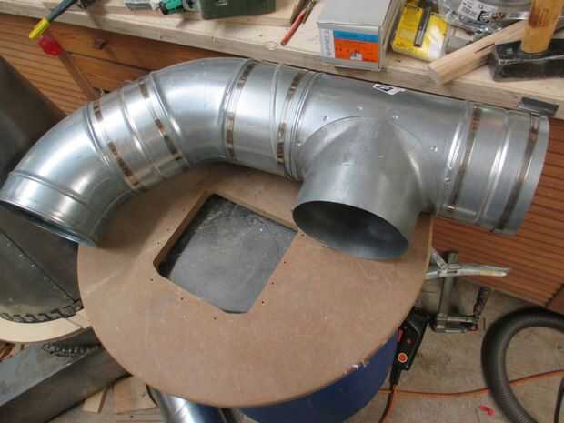 El conducto necesario para conectarse a la bolsa del filtro con placas por lo que dos discos más y anillos que apenas alrededor de los tubos de 150mm. He pegado con pegamento caliente y les apretó con las correas del poder que todo se enfríe después de unos minutos.
