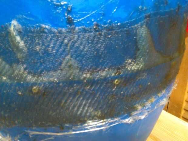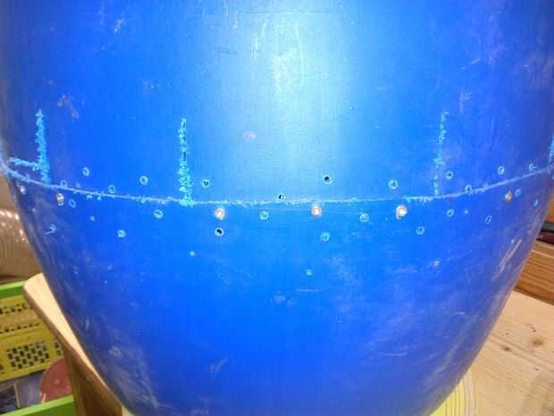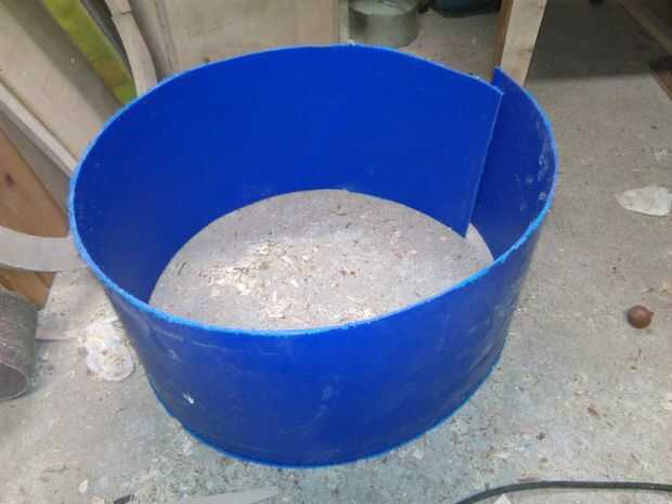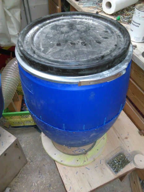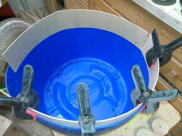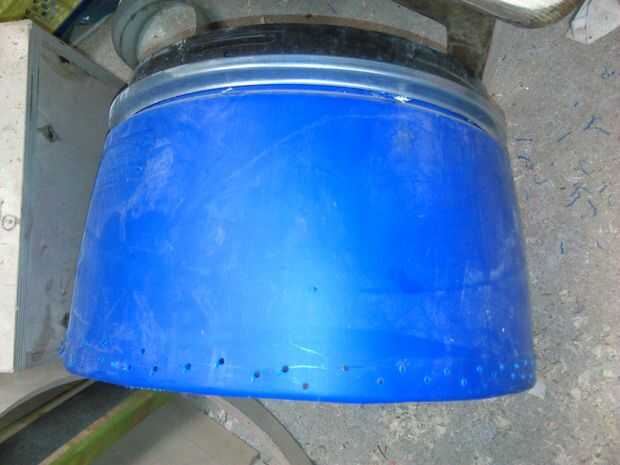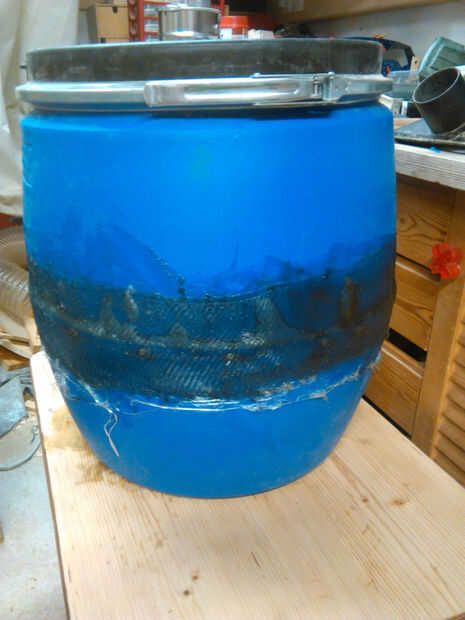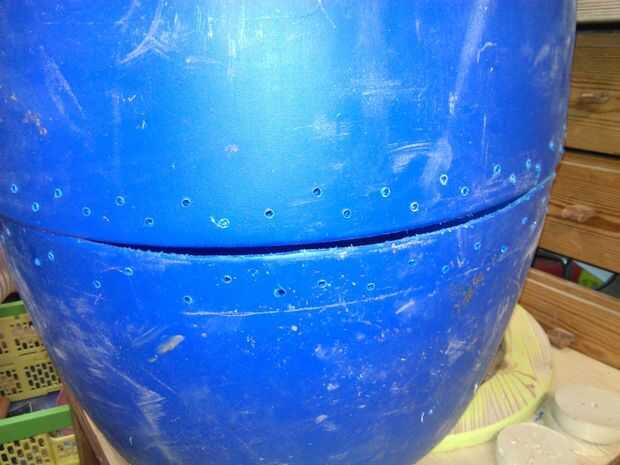Pero desde que didn´t quiero comprar una barrica nueva (y es difícil encontrar uno que sea lo suficientemente ancho pero no alto) decidí acortarlo un poco cortando un trozo de ella y unirse a las restantes partes junto con 2 k-epoxi y fibra de vidrio para reforzar.