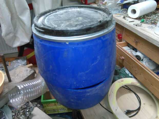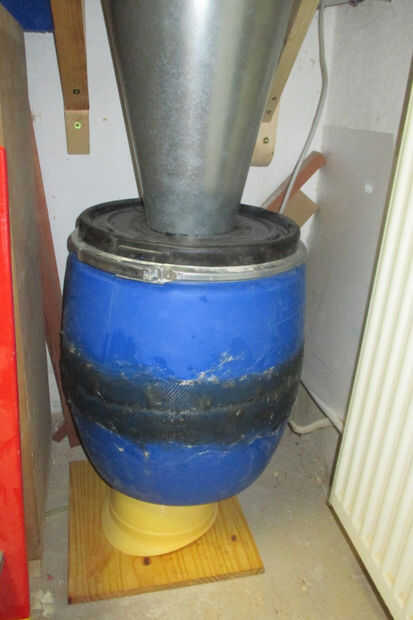 A tierra se inserte algún alambre de cobre pelado alrededor de la parte inferior de la barell y en cuatro lados en la pared a la parte superior y conectar a través de cable de cobre flexible para el ciclón, que sí mismo es puesto a tierra a nuestra casas "igualación potencial" (realmente don´t saber si esto es la palabra correcta) para evitar que las chispas eléctricas encienden el polvo de madera. Podría resultar en una explosión muy grande si se enciende el polvo de madera y saltar el cañón así que cuidado a tierra eléctricamente todo.