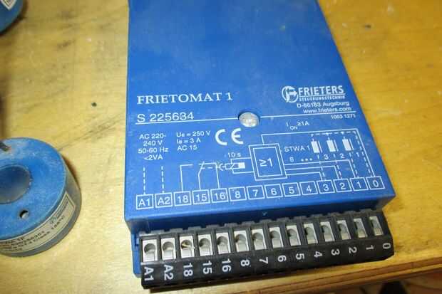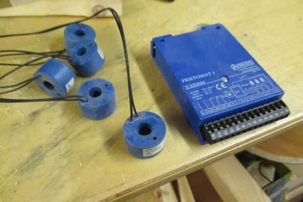 Utiliza una bobina para medir la electricidad que pasa por el cable de alimentación. Si se enciende la máquina, induce corriente en la bobina y el "Frietomat" cambia en el colector de polvo.