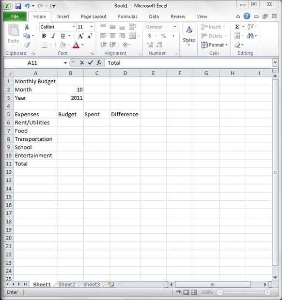 2. en las celdas de la columna A, debajo de "Gastos," entrar en las categorías de gastos que están anticipando su presupuesto mensual. En nuestro ejemplo, en A6, entramos en "Renta/utilidades" A7 es "Alimento", A8 es el "Transporte", A9 es "Escuela" y A10 es un "Entretenimiento". Después de todas las categorías de gastos se han creado, escriba "Total" en la parte inferior de la columna (en nuestro ejemplo, esto es celda A11).