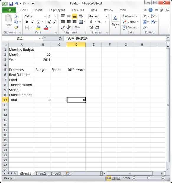 1. en la celda B11, introduzca la fórmula «= SUM(B6:B10);» Esto se suma las cantidades en dólares en las celdas B6 a B10 y mostrar el total en la celda B11.