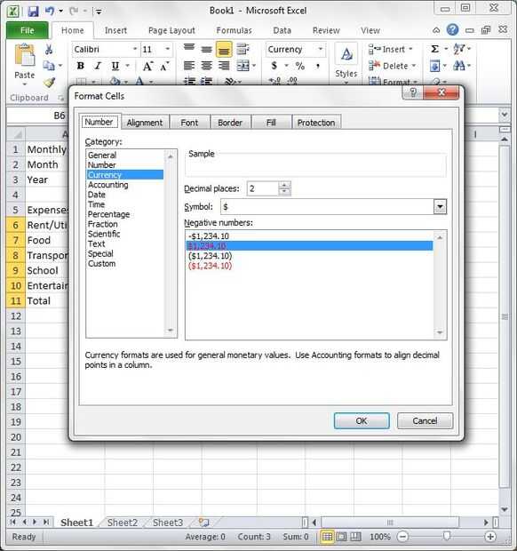 Seleccione el grupo de celda B6 a través D11 arrastrando el ratón a través de esta área rectangular de celdas. Formato de las células como las células de la «Moneda» haciendo clic en [Inicio] > [formato] > [formato de celdas] y seleccionando la categoría de "Moneda" en la pestaña "Números" de la ventana de "Formato de celdas". A utilizar lugares decimales "2" y seleccione la opción de que los números negativos aparecen en fuente de color rojo.