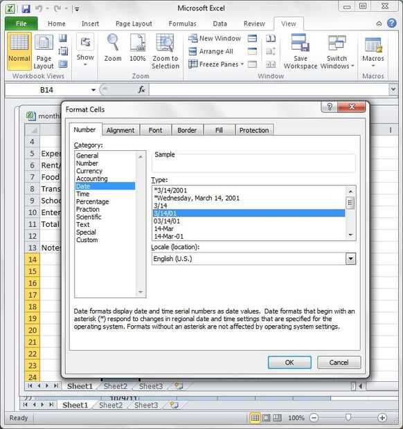 Seleccione celdas B14 a través B44, bajo la columna "Fecha". Formato de las células como las células de la "Fecha" utilizando el mismo método que se muestra anteriormente, sólo que esta vez seleccione la categoría de "Fecha" en la pestaña "Números" de la ventana de "Formato de celdas". En nuestro ejemplo usaremos para nuestro formato de fecha "MM/DD/AA".