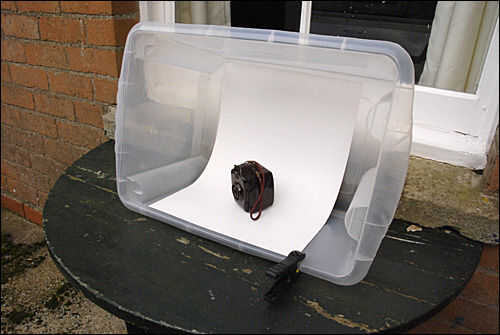 Una tina de plástico translúcido colocado en la sombra, y además una lámina de suave, papel blanco, con una abrazadera de plástico para mantenerla curvada, todo lo que se requiere aislar el fondo, incluso a la iluminación y dar un aspecto limpio producto tiro--todo en menos de cinco minutos y para menos que el precio de una revista de fotografía digital.