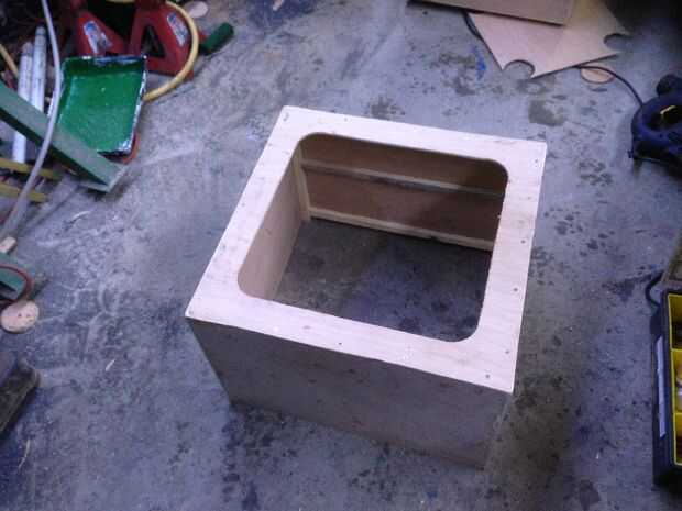Después de atornillar una tapa en la caja de cría, recorte un agujero como se muestra en la fotografía, se trata de donde el cuadro de cría cumple con la doble caja super con un excluder de la reina en el medio. Luego corte un agujero idéntico en el piso de la caja super doble para facilitar esto.