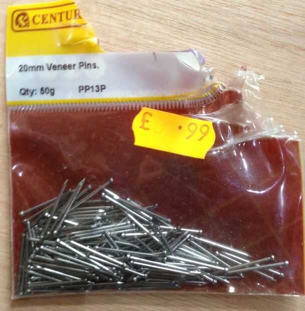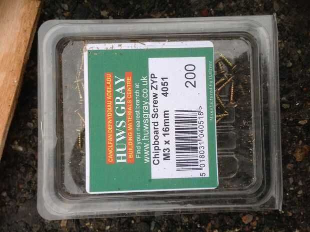 Los tornillos requeridos son 3 x 16 mm x 200 y las clavijas son pasadores de chapa, 20 mm de largo por 1,5 mm de diámetro. Pegamento para madera, es necesaria una poder de expansión de espuma, algunos clavos de 4" y pintura.