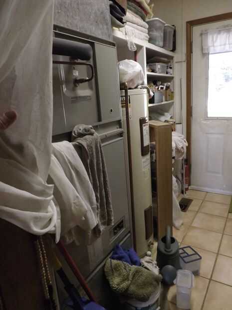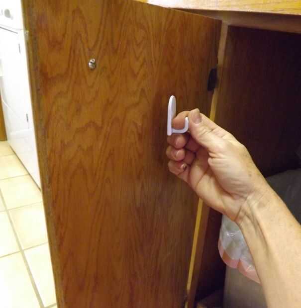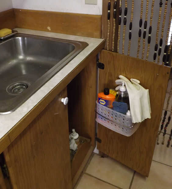 Para ocultar el desorden alrededor del fregadero, añadí dos contenedores baratos debajo del mostrador. Uno fue atornillado a la pared en la parte posterior del gabinete y el otro en la parte posterior de una de las puertas. Además agrega ganchos detrás de una de las puertas del armario. Ahora todos los jabones, esponjas, trapos y guantes están escondidos fuera de vista.