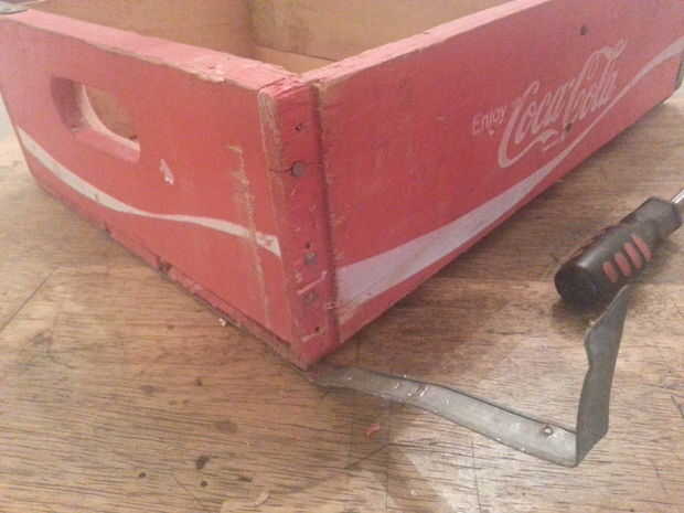 En la mayoría de los cajones de soda, hay una banda de metal que envuelve alrededor de los bordes, clavados, para sujetar la caja juntos. Utilice el destornillador de cabeza plana entre la madera y la banda y palanquee suavemente las uñas un poco. No te preocupes doblar la banda, ya que es muy fácil enderezar nuevamente con el martillo durante el reensamblaje.