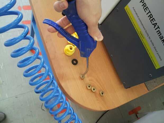 Use una pistola de aire comprimido para limpiar el orificio del lado de la oferta de la boquilla. Funciona mejor para sostener la boquilla en la mano durante la limpieza con la pistola de aire.