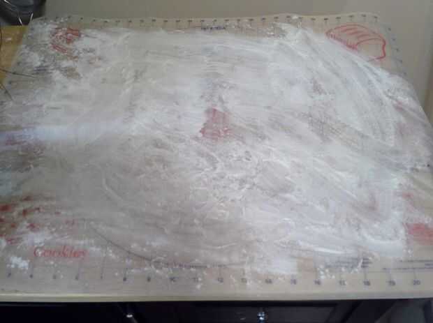 Día para hornear, preparar la superficie de trabajo. Utilizar un tapete plástico pastelería para trabajar en pero se puede elegir cualquier superficie limpia que está disponible. Aplique una cantidad abundante de harina como en la imagen.