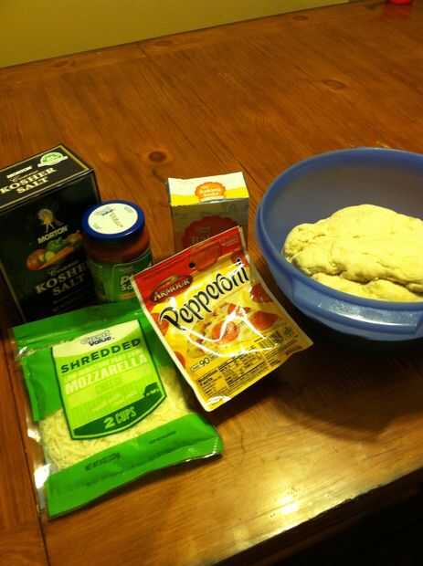 Vas a necesitar masa pretzel y bicarbonato de sodio. (Ver para la receta de baño de masa y bicarbonato de sodio de pretzel. Puede la mitad de la receta de bicarbonato de sodio aunque para éste.). Haz salsa pizza, mozzarella rallada, un poco de mantequilla derretido y cualquiera de sus ingredientes de pizza favorita.