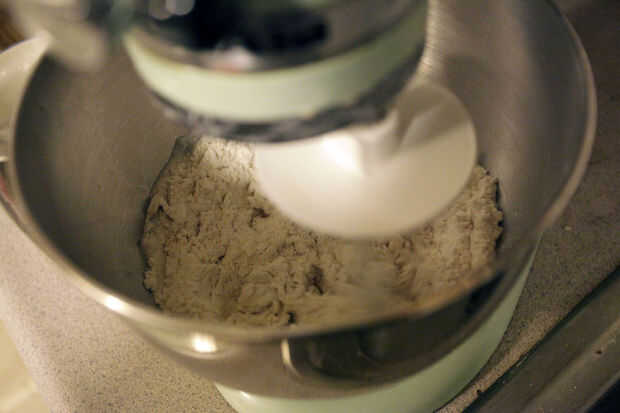 Con el gancho para masa en la batidora, añadí la harina, la sal y el azúcar. Agregue lentamente los ingredientes secos para que no vuele fuera de la batidora. Una vez que se integran todos los ingredientes, amase en medio-bajo durante cinco minutos.