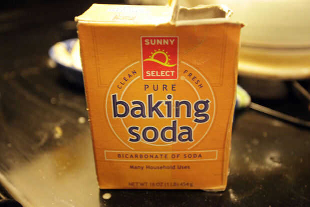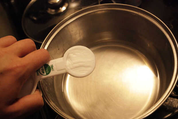 Para hacer la capa de bicarbonato de sodio, mezcla una taza de agua hirviendo con 2 cucharadas de bicarbonato de sodio.  Mezcla homogénea, luego dejar enfriar en la cacerola.