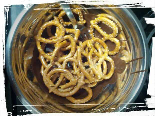 Derrita el chocolate en baño María (derrita lo en una olla de metal, se basaba en una pequeña olla de agua hirviendo. Double-boiler hack de cocina, whoot whoot!). Descarga bolsa de pretzel en el chocolate derretido. Revuelva hasta que estén cubiertas.