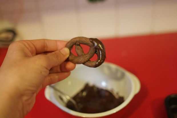 Si cualquiera de las formas de pretzel se rompió después de la cocción, ahora es el momento de solucionarlos. Asegúrese de que usted conseguir suficiente chocolate en ambos de los trozos, les pega añade otra capa de glaseado de chocolate alrededor de la costura y entonces no moverlo hasta que se establezca.