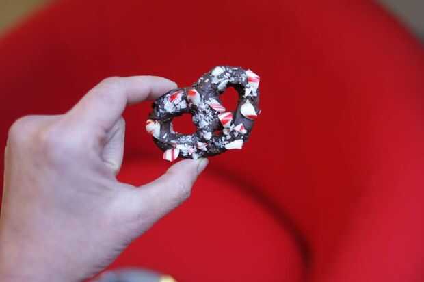 Una vez que haya terminado todos los pretzels, establecer las galletas enteras en la nevera al menos una media hora hasta que el chocolate ha puesto (puede que desee esperar un poco más si tiene piezas pega).