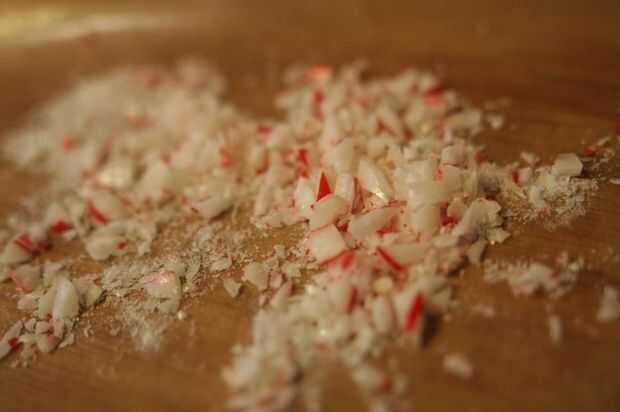 Cuando haya terminado debe tener dos bastones de caramelo bien pulverizada, con pequeñas escamas de menta.