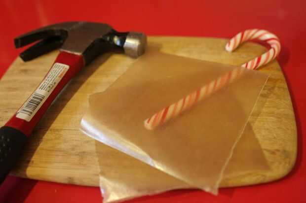 Uno a la vez, coloque un bastón de caramelo entre dos hojas de papel de cera.