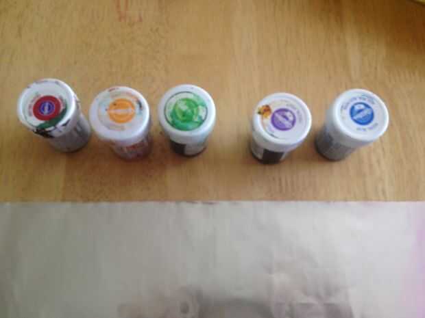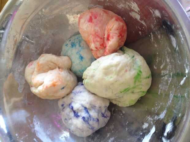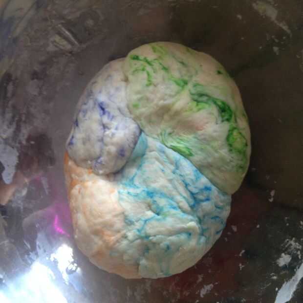 Dividir la masa en 4 porciones y agregar suficiente gel colorante a cada uno de ellos (yo uso azul, verde, púrpura, rojo y naranja) - unos 3-5 gota/la punta de un palillo, amasar