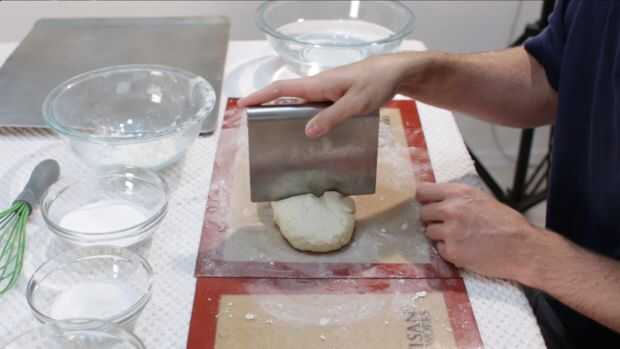 A continuación precalienta el horno a 450 grados F. Ahora después de que la masa ha aumentado maravillosamente, nos tome un cortador de pasta o un cuchillo y dividir la masa en 6 partes iguales o si usted dobla la receta, dividirla en 12 partes iguales.