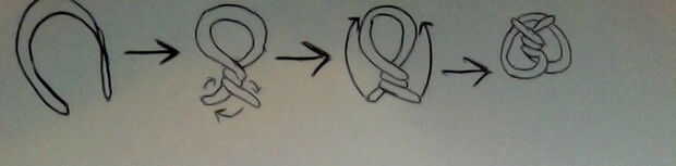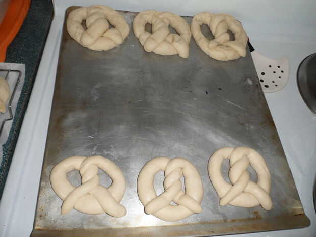 Cortar la masa en trozos de igual tamaño 12. Rodillo en forma de "cuerdas." Torcer las cuerdas en forma de pretzel.  (ver foto). Coloque en una bandeja para hornear engrasada. Dejarlos leudar 20 minutos. Los pretzels pueden encoger un poco después de ser estirada, pero está bien.