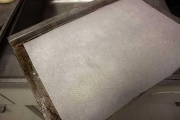 Retirar y luego apartar la hoja de pergamino engrasado en una bandeja de horno.