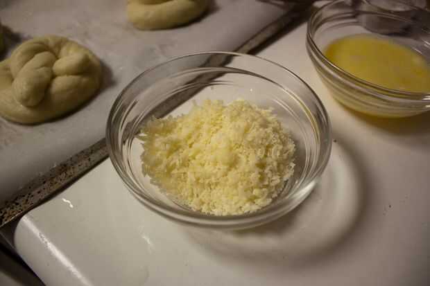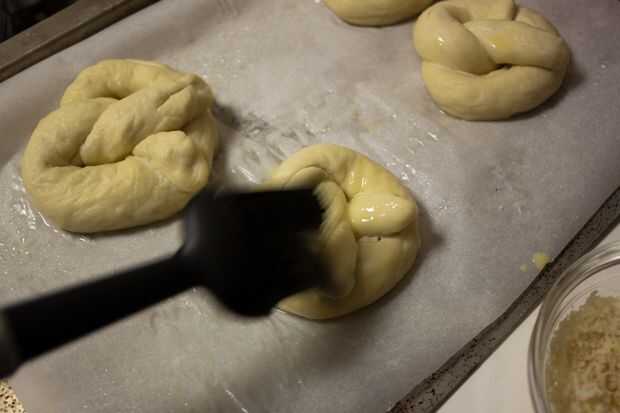 cepillo los pretzels con mezcla de huevo y añadir espolvorear en sus ingredientes.