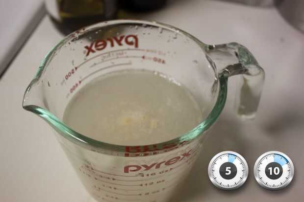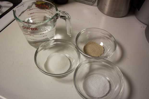 1 y 1/2 tazas de agua tibia (110 grados F, a la temperatura de un baño cómodo. Ningún más caliente y corre el riesgo de matar la levadura), agitar para disolver.