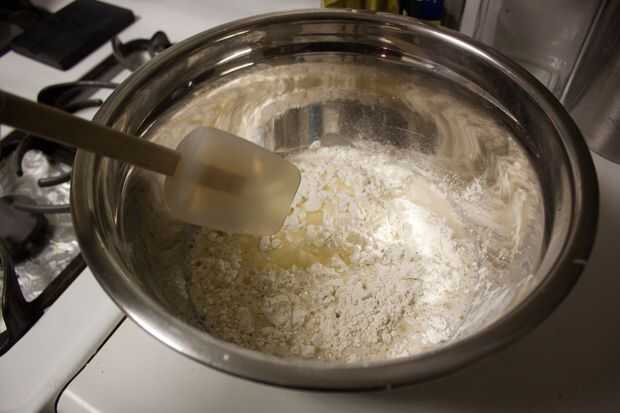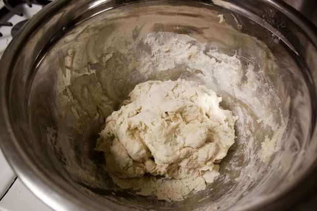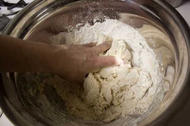 Empecé con una espátula antiadherente y luego pasó a mis manos, pero puede empezar con las manos si quieres, pero no es recomendable una batidora o procesador de alimentos. Mezclar los ingredientes lo suficiente como para crear una masa peluda.