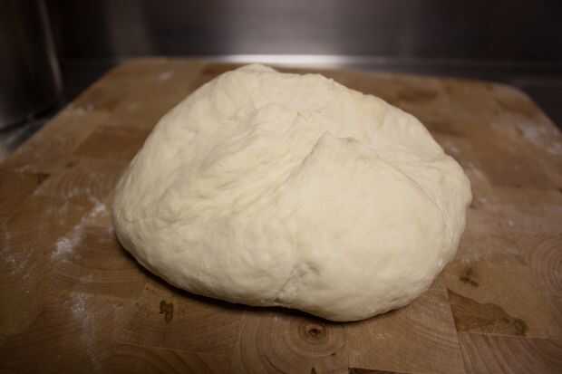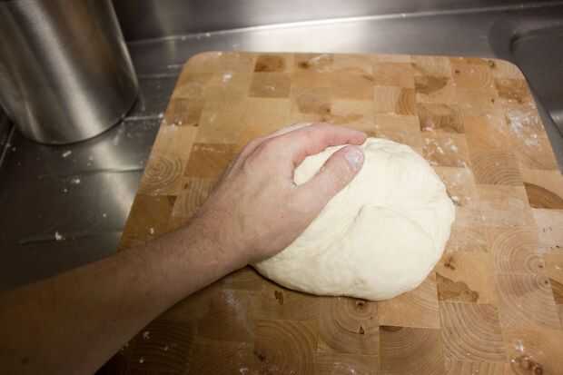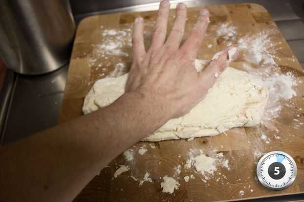 Amasar durante 5 minutos. Si la pasta se pega, harina a la superficie lo suficiente como para evitar que se pegue.