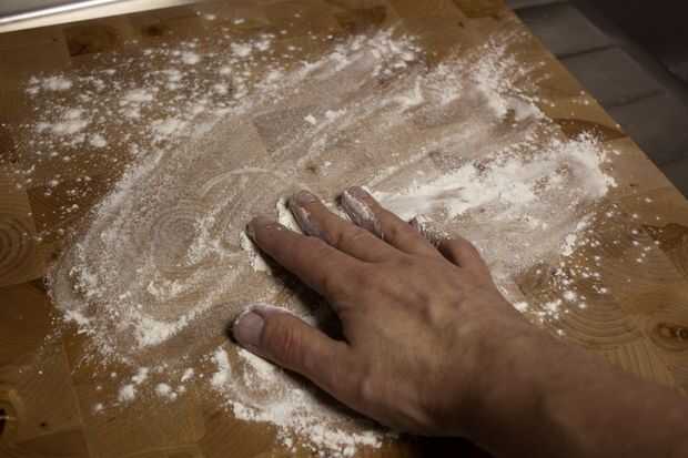 Una superficie de trabajo limpia la harina y el rodillo la masa sobre ella.  Mantener su harina cerca!