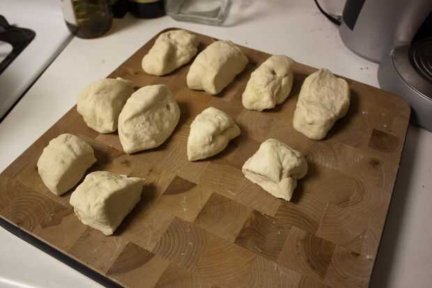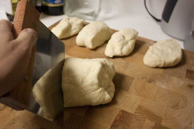 Una vez amasada, dividir la masa (o corte con un divisor/raspador de masa) en trozos de igual tamaño de 8-12.