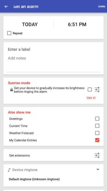 Abrir la aplicación AlarmPad y agregar una nueva alarma: establece en cualquier momento (no importante), a continuación seleccione repetir cada semana, seleccione el más botón "Opciones" y marque la opción "Mi calendario de entradas".