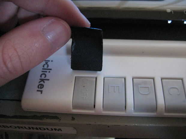 Cortar el protector a la medida con unas tijeras y finalizado el tamaño con un archivo. Luego usé un mechero para ablandar el plástico donde quería que curva alrededor del borde de la iClicker y había doblado en forma con un par de pinzas. Tuve que calentar y doblar varias veces para obtener la forma exacta que estaba buscando. Entonces solía un rectángulo de cinta eléctrica Conecte en mientras sigue permitiendo que ser movido de un tirón para arriba así que todavía puede presionar el botón de encendido. No estoy seguro de qué tan bien la cinta aislante mantendrá con el tiempo, pero es bastante flexible cinta aislante, por lo que puede durar bastante tiempo. Sería posible hacer este diseño más permanente por colocar una rótula plástica, pero esto es sólo un prototipo temprano.