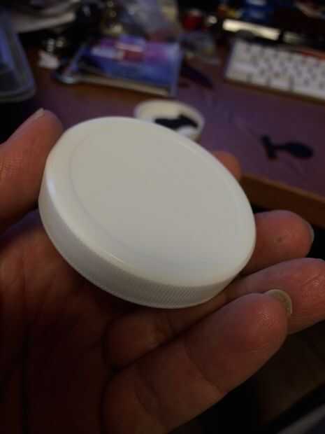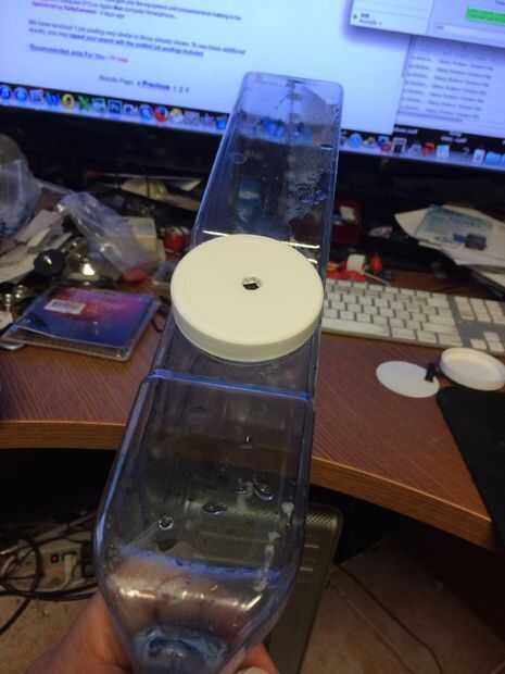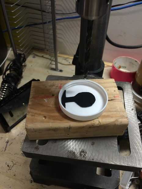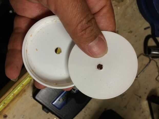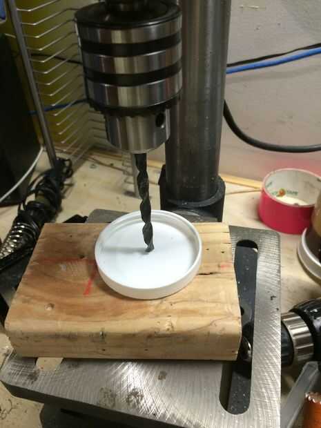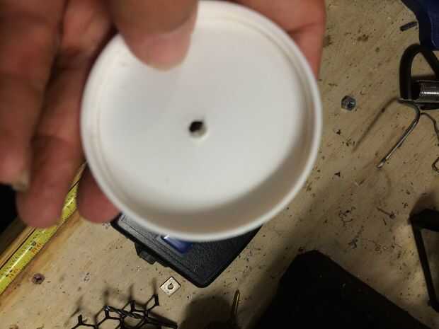 (imagen #3) hacer una aleta y una zona tapón, coloque la tapa del contenedor de agua, marca un agujero de centro, taladro (1/4 agujero es bastante grande) Asegúrese de deshacerse de los bordes que, recortar la solapa y pegamento seguro alimentos impermeable (silicona 100% es uno) o doble palo aleta pegamento de cinta scotch sobre el orificio de la parte inferior. (Asegúrese de que usted deja el pegamento alrededor de la zona / cinta gratis para poder abrir la aleta y cerrar)